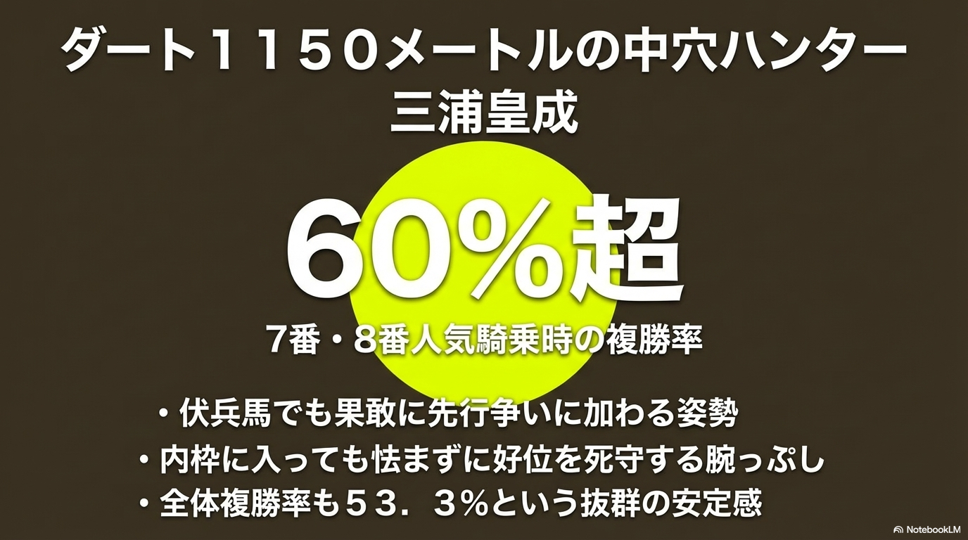 三浦騎手はダート1150mで複勝率53.3%と、2回に1回は馬券に絡む安定感を見せています。特に面白いデータが、7〜8番人気の中穴馬に乗った際の複勝率が60%を超えているという点です。人気馬をきっちり持ってくるのはもちろんですが、伏兵馬でも先行争いに果敢に加わり、内枠でも怯まずに好位を死守する姿勢が、高配当を演出する鍵になっているかなと思います。もし、田辺騎手と三浦騎手が隣り合った枠に入っていたら、それだけで期待値が爆上がりしてしまいますよね。
