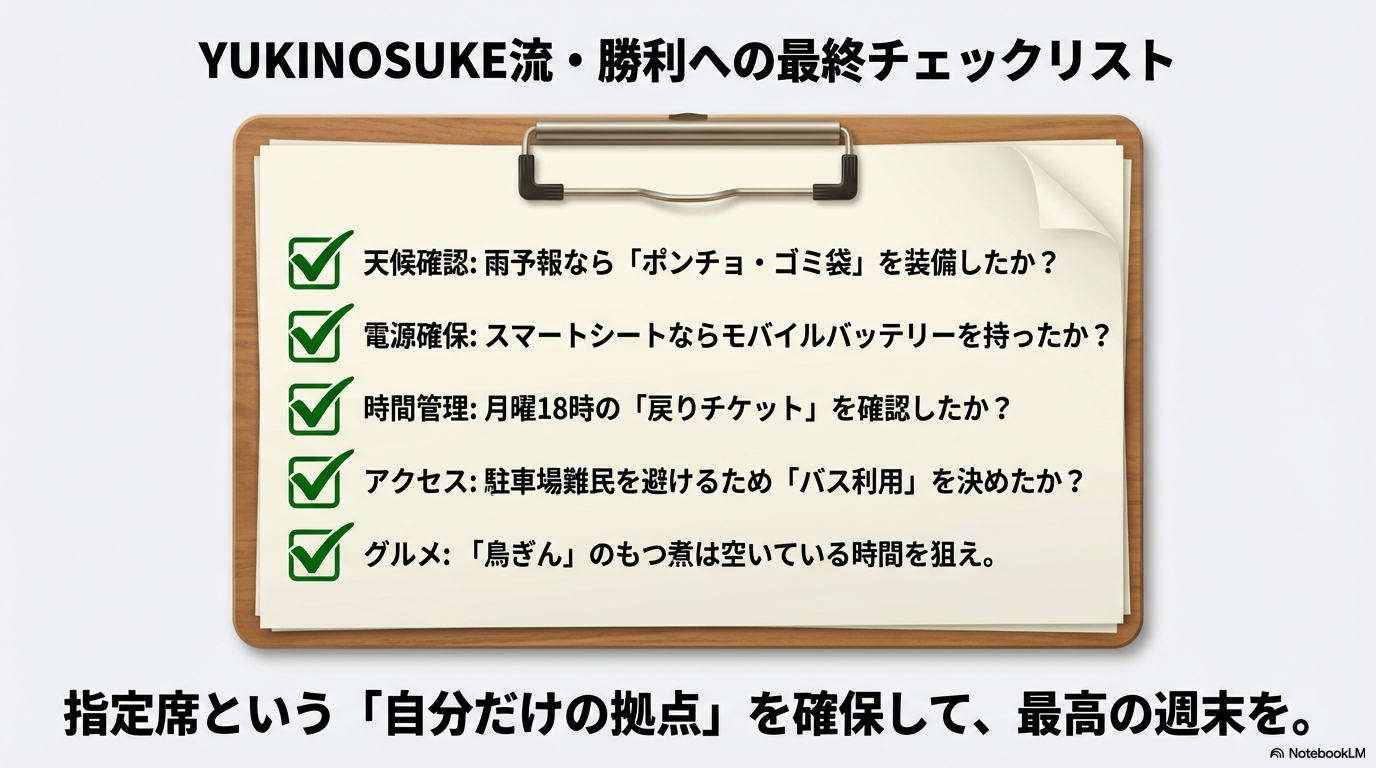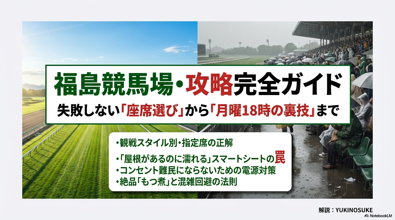 改めてお伝えしたいのは、「座席選びは、その日の戦果(満足度)を決定づける最初のレースである」ということです。「屋内か屋外か」という環境の違い、「コンセントがあるかないか」というインフラの差、そして「駐車場をどう確保するか」というロジスティクス。これら全ての要素を天候や同行者に合わせてシミュレーションできた人だけが、当日の福島競馬場を120%楽しむことができます。