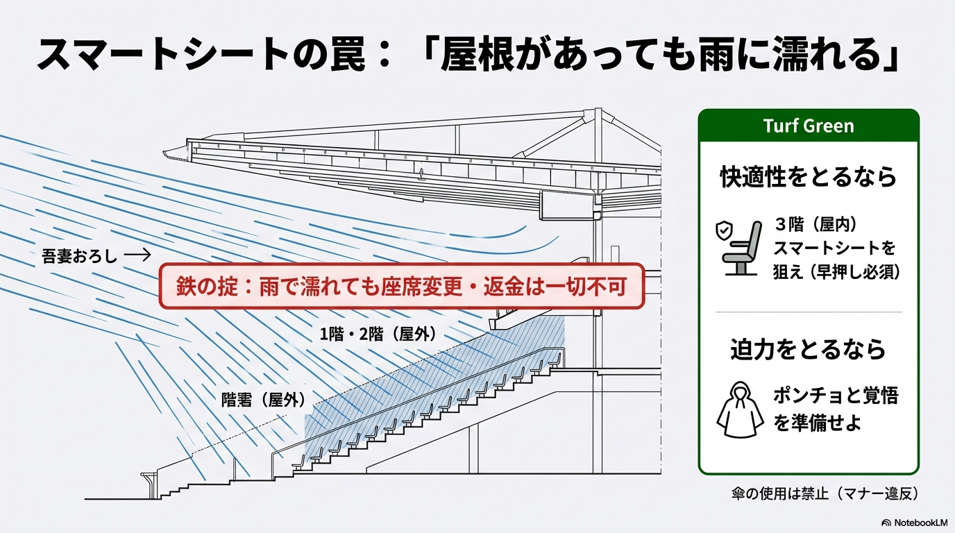 ここで最も強調しておきたいのが、JRAの厳格なルールです。公式サイトにも明記されていますが、「雨に濡れる席であっても、座席の変更や料金の払い戻しは一切行われない」という規定があります。