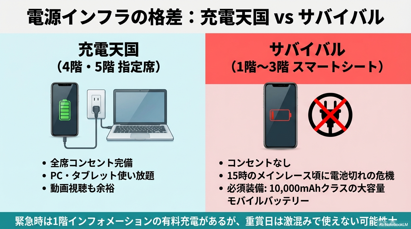 現代の競馬観戦において、スマートフォンのバッテリー残量は、軍資金と同じくらい重要な「資産」です。馬券の購入(ネット投票)、オッズの確認、レース映像のリプレイ視聴、そしてSNSでの情報収集など、スマホがなければ戦えないと言っても過言ではありません。だからこそ、福島競馬場の座席選びにおいて私が声を大にしてお伝えしたいのが、「席種による電源インフラの格差」です。