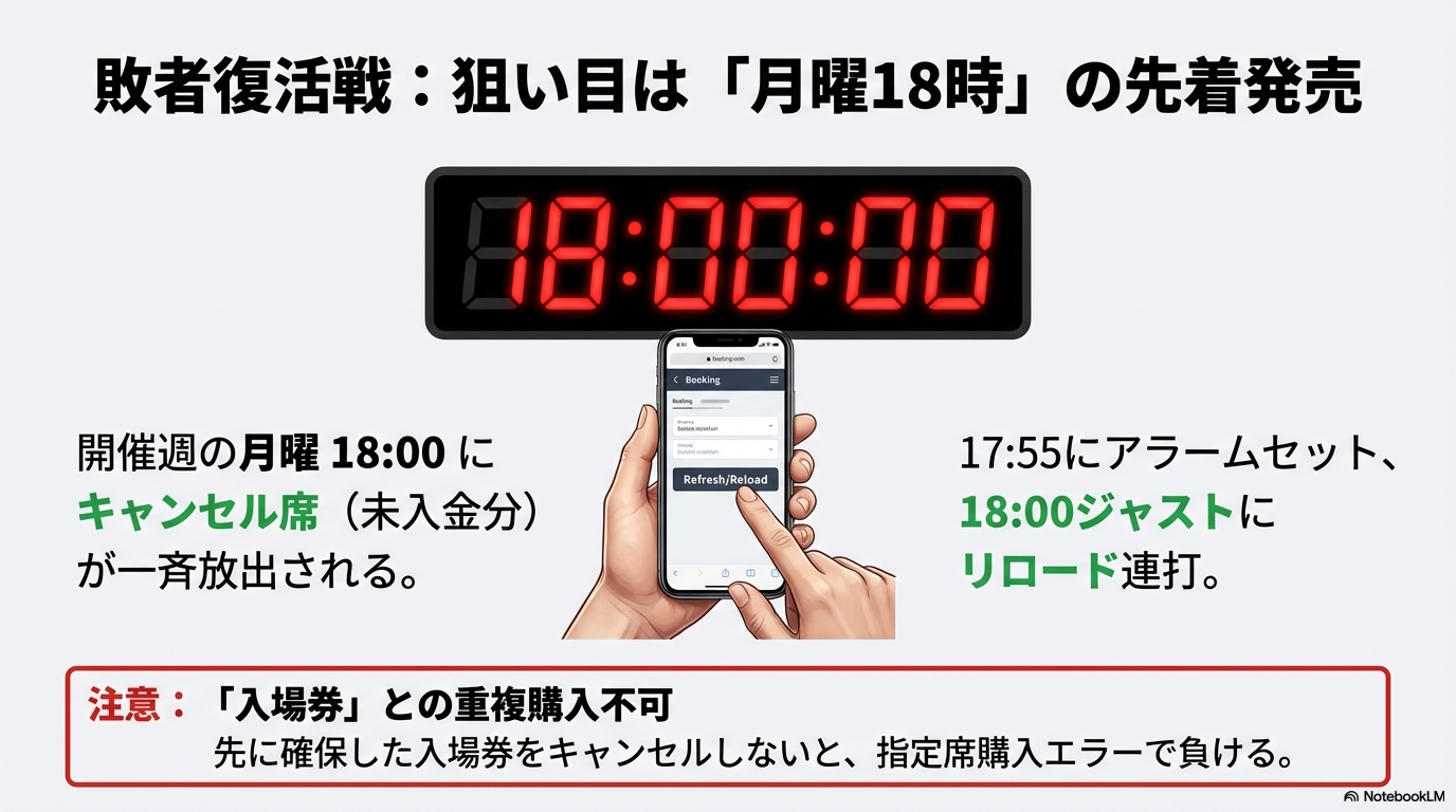 - 予約の壁: 「月曜18時」のキャンセル席放出を狙う準備はできているか?