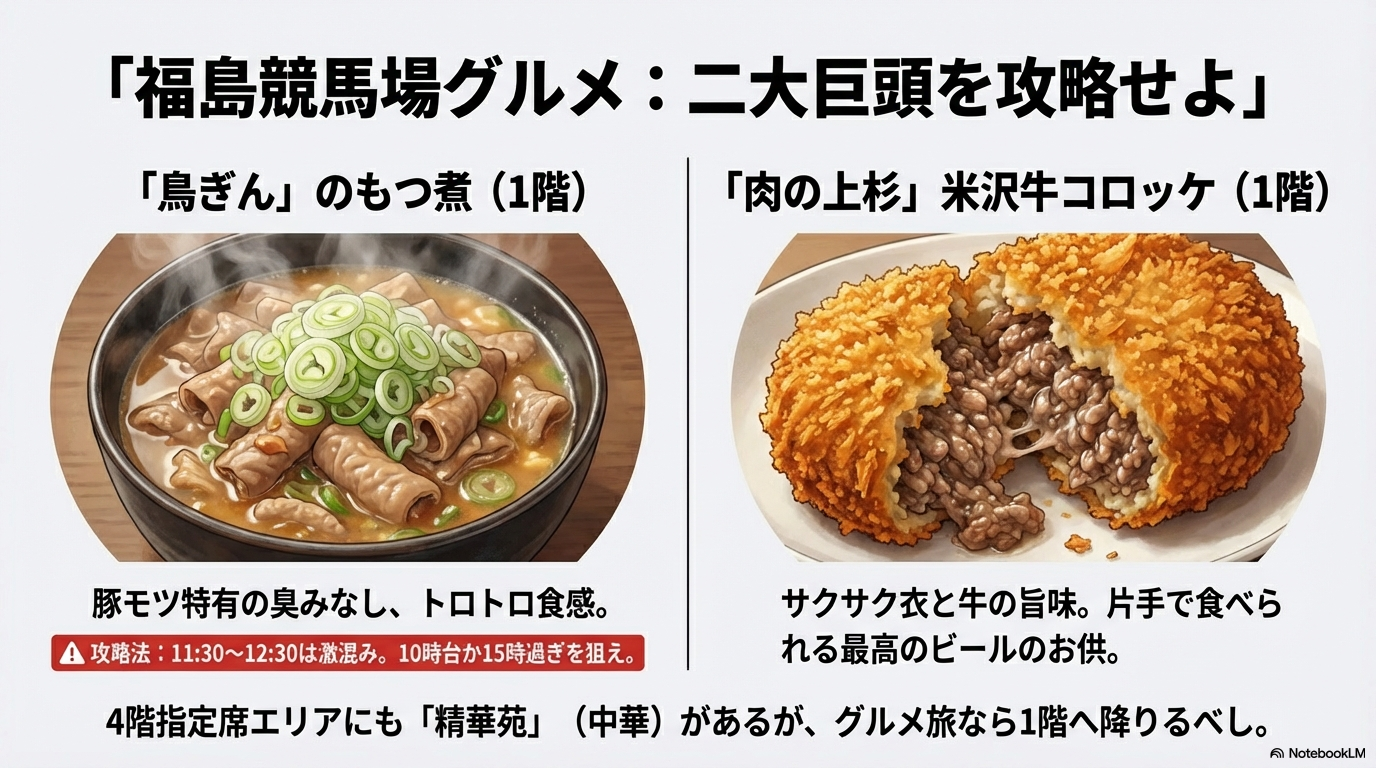 福島競馬場のグルメは、スタンド1階の「ファストフードプラザ」に名店が集中しています。指定席のある4階・5階からは少し距離がありますが、エレベーターを使ってでも買いに行く価値のある「二大巨頭」をご紹介します。