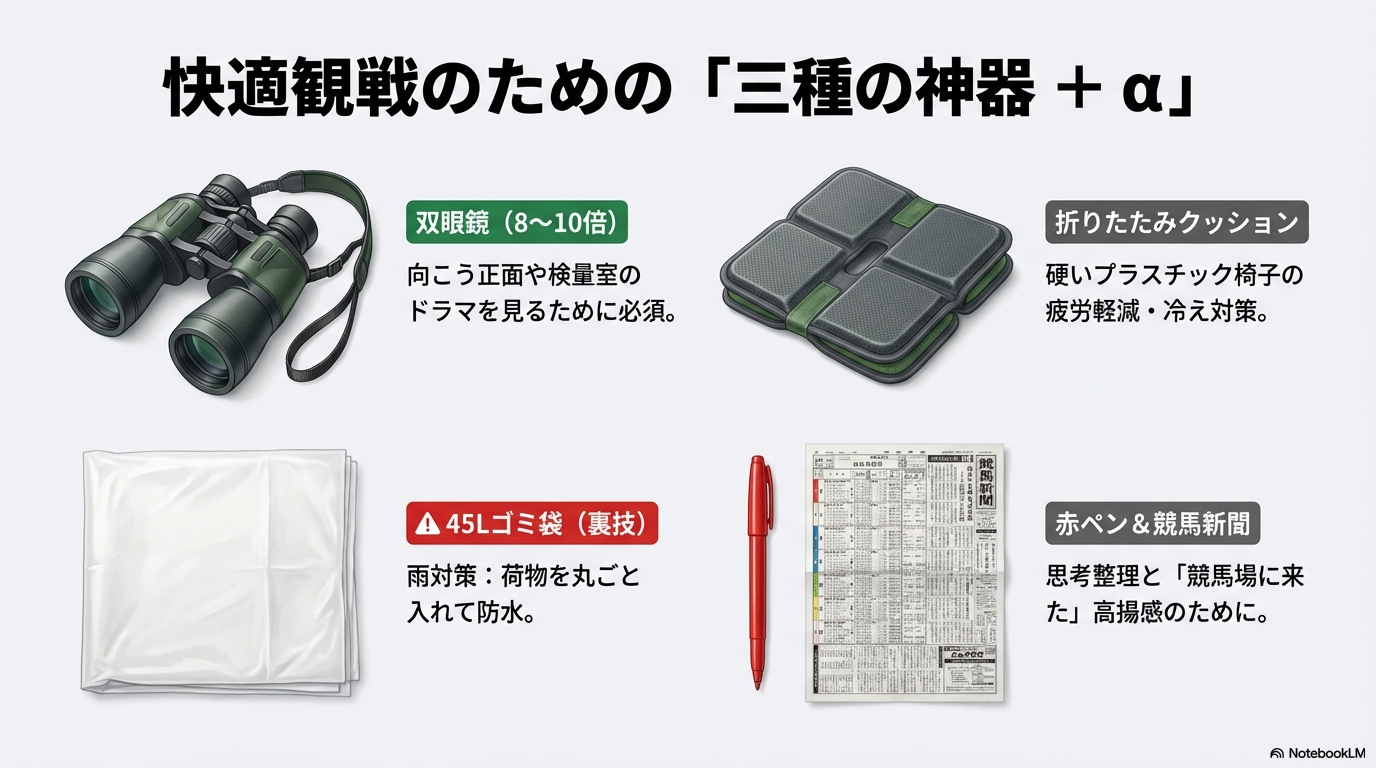 指定席を確保したからといって、手ぶらで現地に行くと痛い目を見ることがあります。長時間の観戦を「ただの疲れるイベント」にするか、「快適で最高の思い出」にするかは、事前の準備にかかっています。私が長年の遠征経験から導き出した、福島競馬場攻略のための「三種の神器+α(アルファ)」をご紹介します。これさえあれば、あなたはもう立派な競馬旅のプロフェッショナルです。