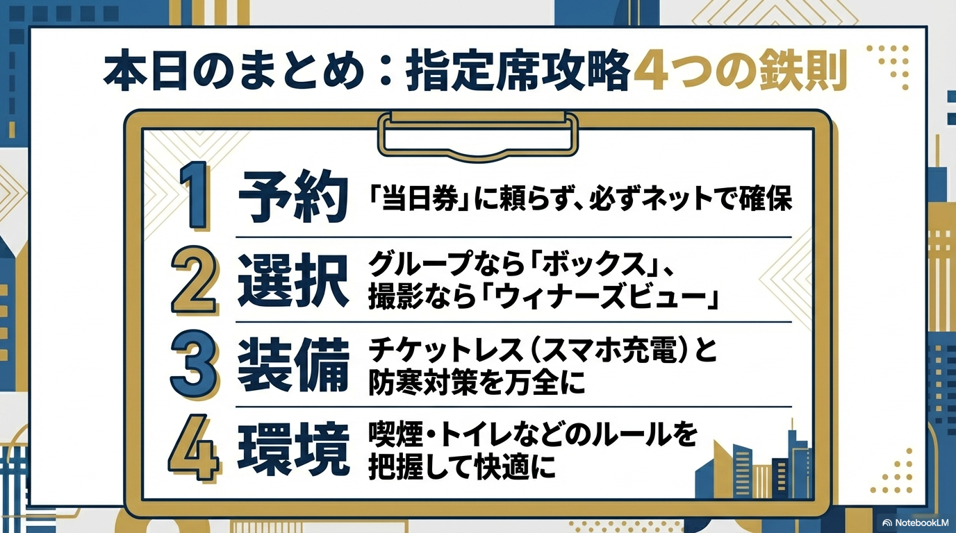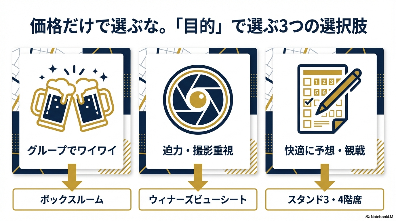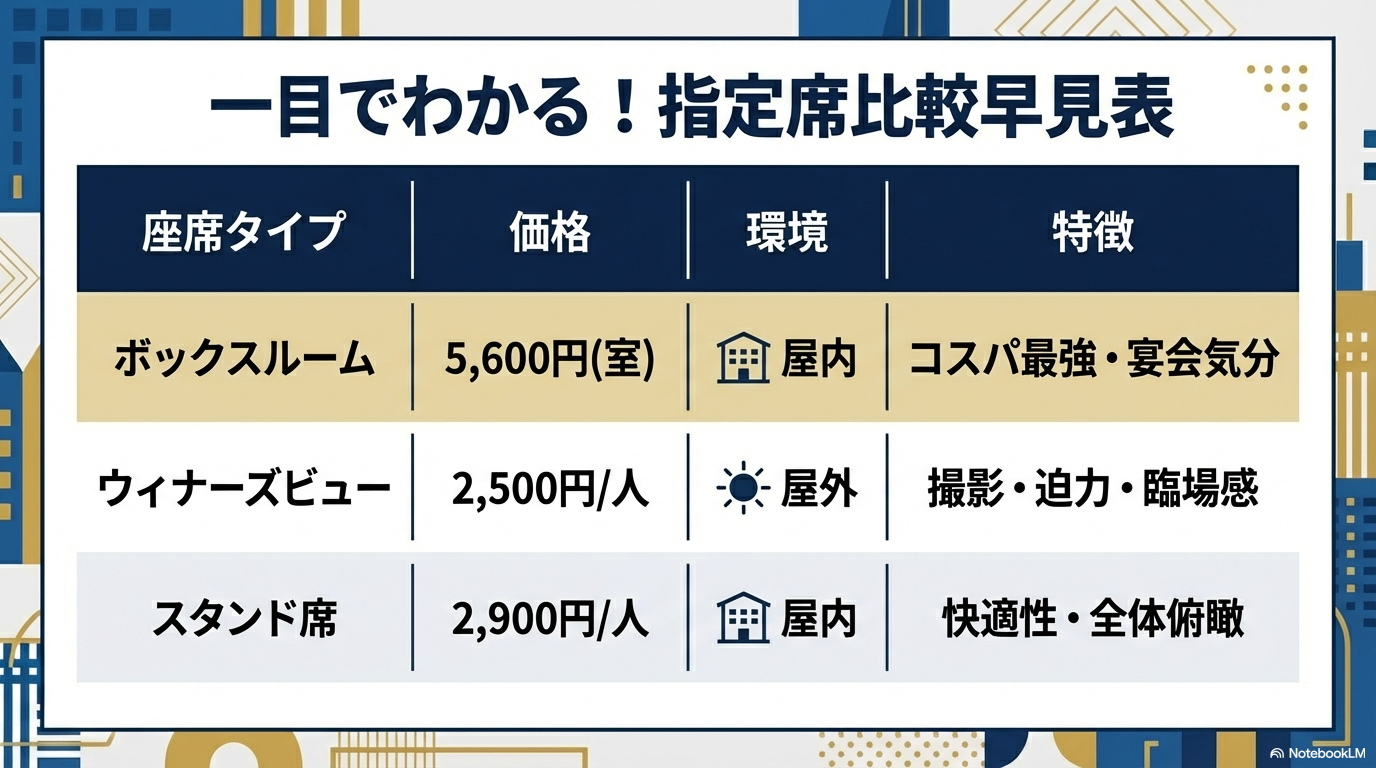 - 座席の選び方:コスパ最強の「ボックス席」から迫力の「ウィナーズビュー」まで、目的別の正解を紹介