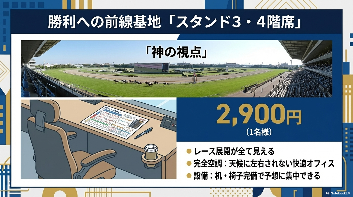 「今日は本気で勝ちに行きたい」「レースの展開を一瞬も見逃したくない」 そんな本格派のファンや、一人でじっくりと予想の森に迷い込みたい方にとって、スタンド3階・4階の指定席(2,900円)は、まさに最強の「前線基地(ベースキャンプ)」となります。 1階の一般エリアで、焼きそばの香りと人々の熱気に包まれながら観戦するのも競馬の醍醐味ですが、指定席エリアに足を踏み入れると、そこには全く別の世界が広がっています。静寂と冷暖房完備の快適空間、そして何よりも眼下に広がる「神の視点」。ここでは、なぜこの席が玄人たちに愛され続けるのか、その理由を深掘りしてみましょう。