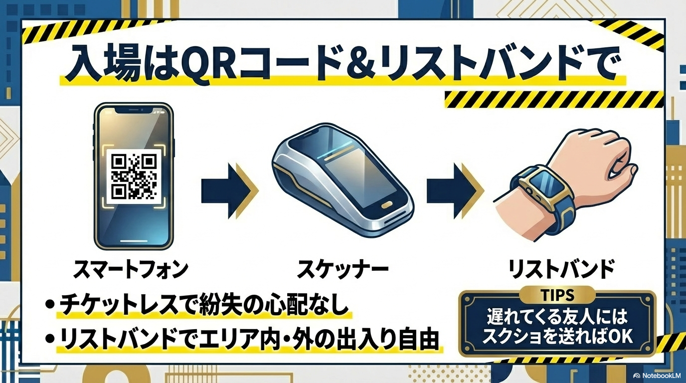 - リストバンドを受け取る 認証が完了すると、その日の通行手形となる「リストバンド」が手渡されます。その場で手首にしっかりと巻き付けましょう(スタッフが巻いてくれる場合もあります)。
