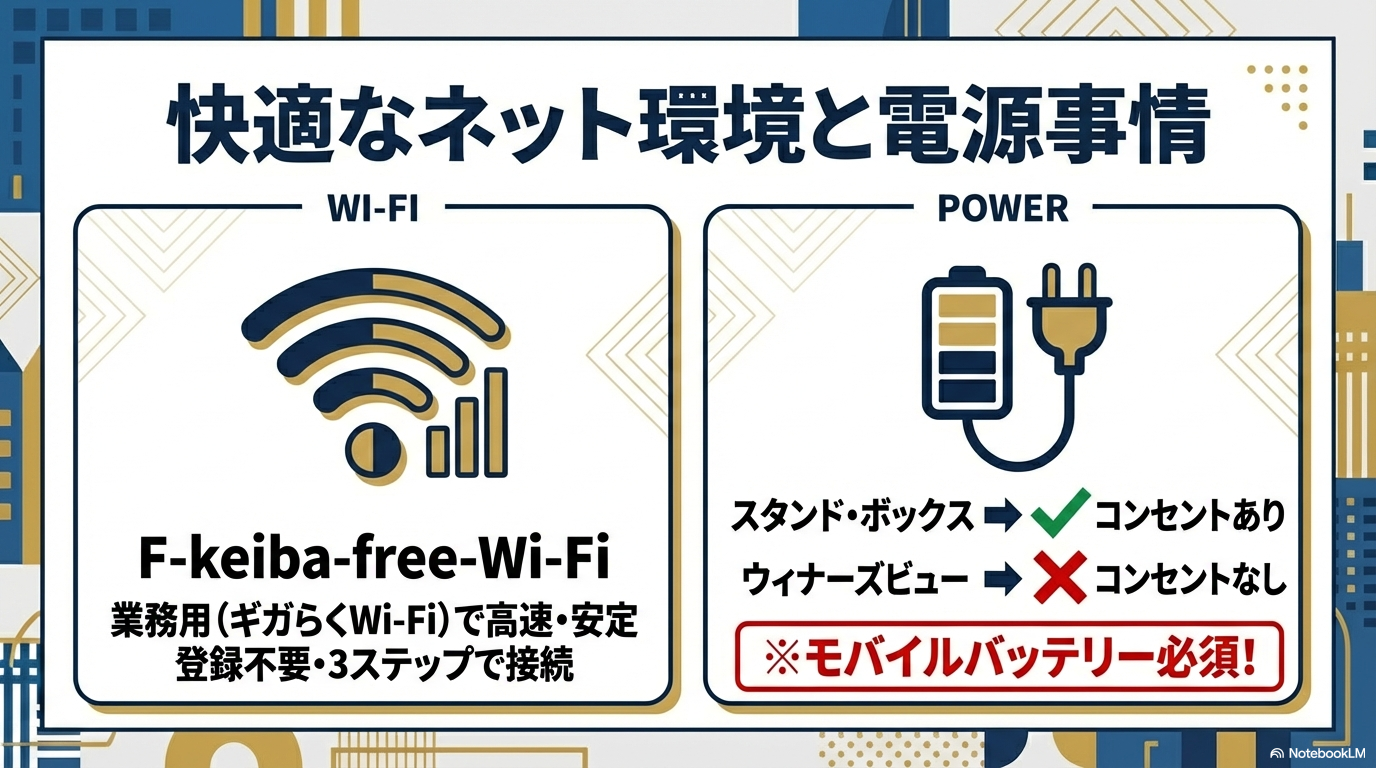 Wi-Fiと同じくらい重要なのが、スマートフォンのバッテリー問題です。通信環境が整っていても、電池が切れてしまっては元も子もありません。 船橋競馬場の指定席エリアにおけるコンセント設置状況は、座席タイプによって明確に異なります。