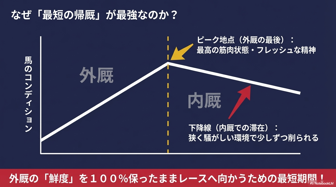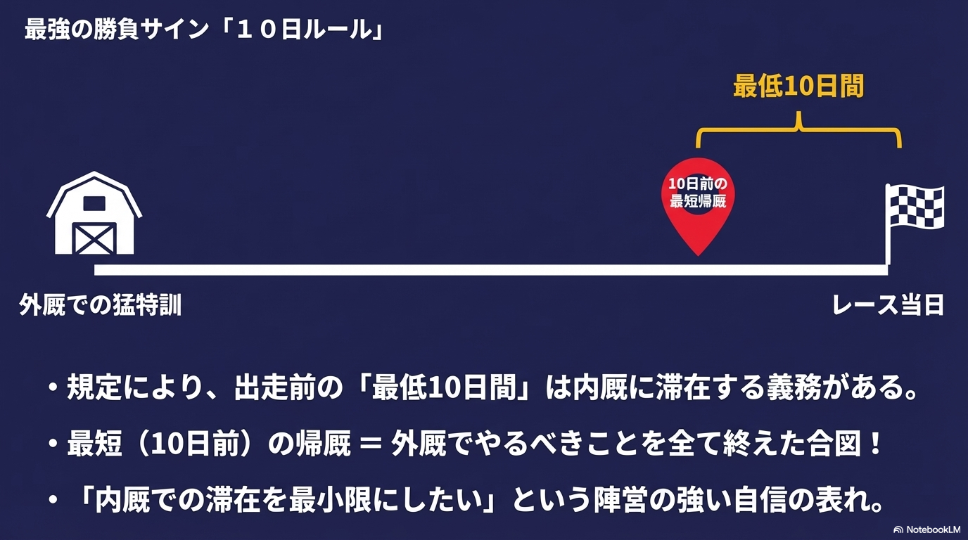 最短の10日前ギリギリで戻ってきたのか、それとも余裕を持って20日前に戻ってきたのか。この滞在日数の差が、外厩での仕上げの深さを物語ります。最短期間での帰厩は「外厩でやるべきことは全てやった、あとはゲートを通すだけだ」という陣営の強い自信の表れであるケースが多いんです。この「情報の裏側」を読み解く力こそが、現代競馬の醍醐味だと言えるでしょう。