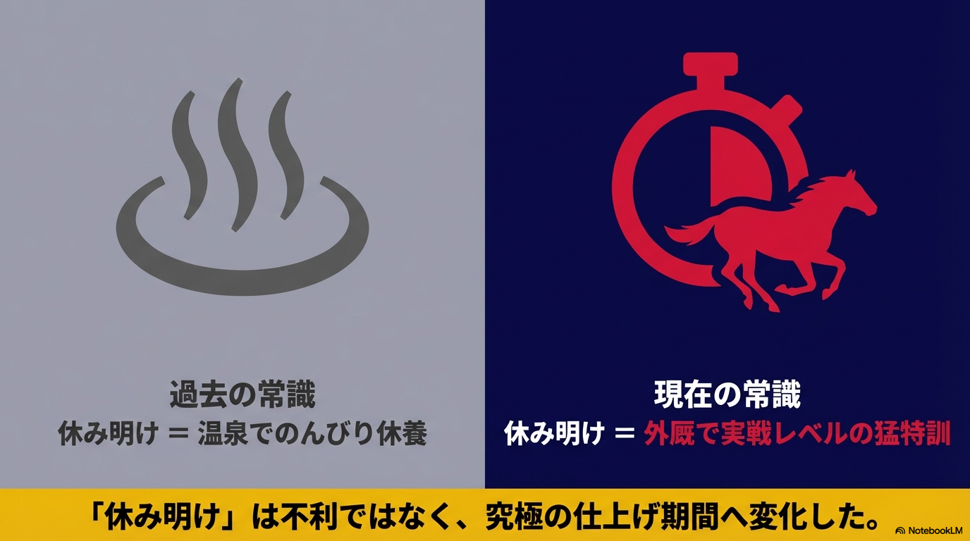 この劇的な変化を支えているのが、外厩による「実戦並みの仕上げ」です。ノーザンファーム天栄やしがらきといった施設では、トレセンに戻る前の段階で心肺機能や筋肉の状態を100%に近く仕上げることが可能です。私たちが予想をする際は、まず「休み明け」というだけで評価を下げるのではなく、どこの外厩で調整されたかを確認することが、的中率を劇的に変える第一歩になるんですね。