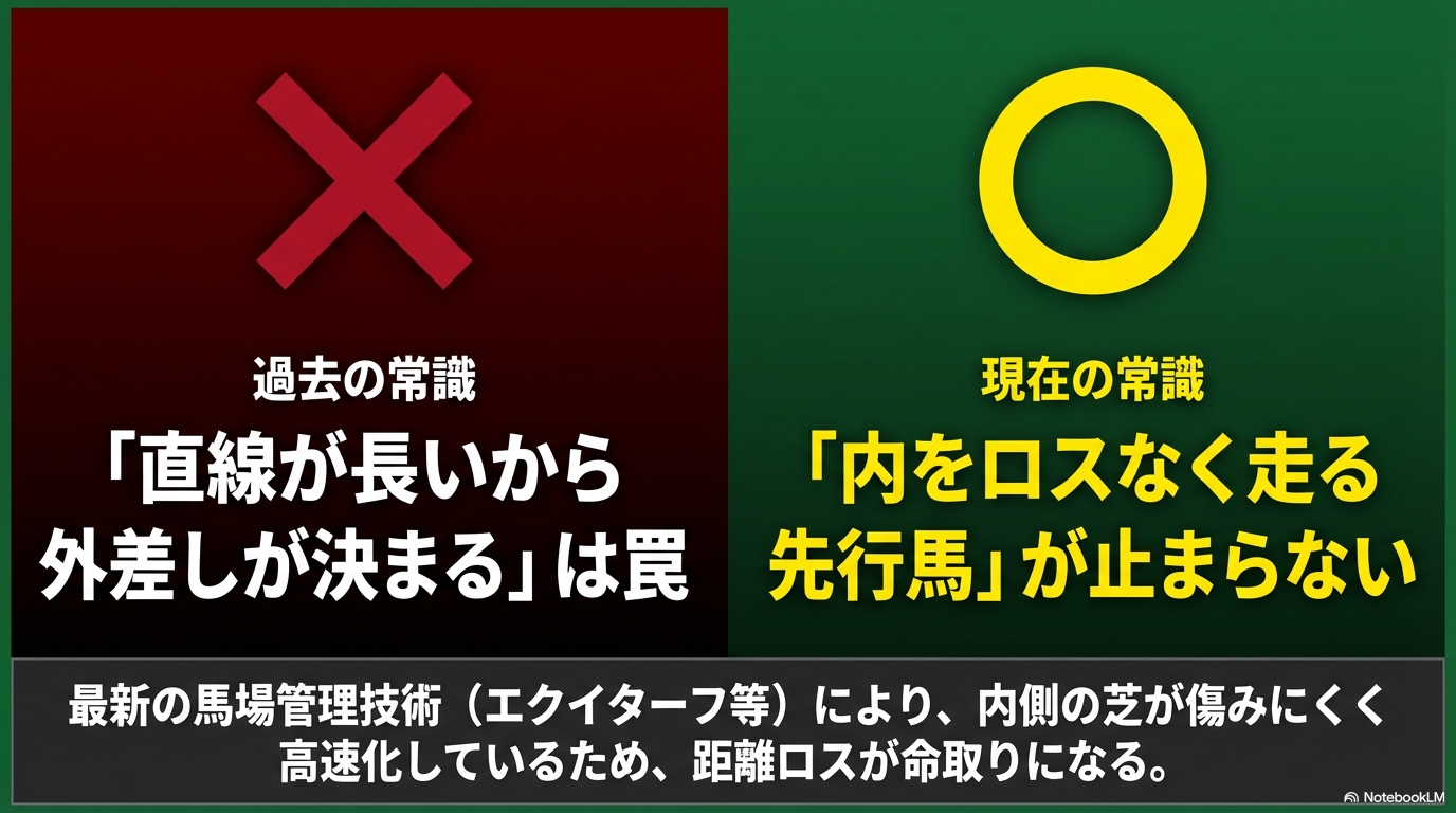 • 「外差しイメージ」の逆を突く:多くのファンが「直線が長いから外差し」と思い込んでいる時こそ、内枠で死んだふりをする先行馬の期待値が跳ね上がる。