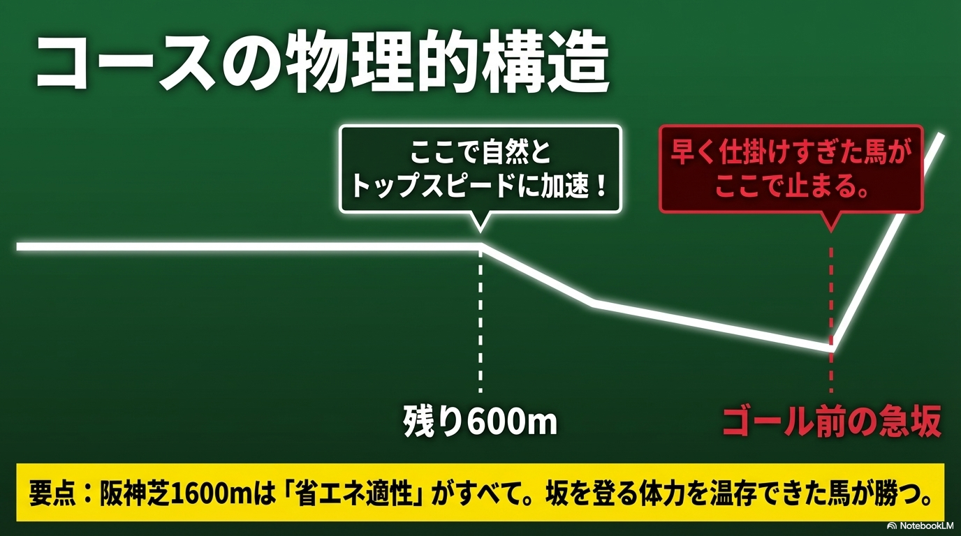 そして、阪神芝1600mの攻略において最大の焦点となるのが、約474メートルという右回り最大級の直線、その終端に待ち構える高低差1.8メートルの急坂です。残り200メートル地点付近からゴールにかけて一気に登るこの坂は、単なるスピード自慢の馬たちを絶望の淵に突き落とします。乳酸が溜まりきった極限状態で、この坂をパワーでねじ伏せなければ勝利はありません。