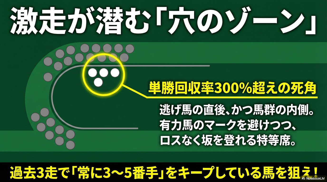 この位置は、データ上では「差し」に分類されますが、完全な追い込み勢ほど後ろすぎず、かと言って先行集団のように有力馬からのマークを真っ向から受けることもない、まさに「ブラインドスポット(死角)」になっています。この「穴のゾーン」から、最後の直線で上がり3ハロン上位3位以内の脚を使える馬がいれば、単勝万馬券を演出する可能性が飛躍的に高まります。私が調べた特定の条件下では、このポジションからの単勝回収率が300%を超えているケースもありました。逆に、初角10番手以下になってしまうと、よほどの「怪物級」の末脚を持った人気馬でない限り、勝率はゼロに近づくという厳しい現実も過去のデータ(出典:日本中央競馬会(JRA)『GIレース 阪神ジュベナイルフィリーズ 過去の成績』)が示しています。この傾向は、特に馬場が高速化し、内側の芝が傷みにくくなった近年のトレンドにおいて、より顕著になっている印象ですね。