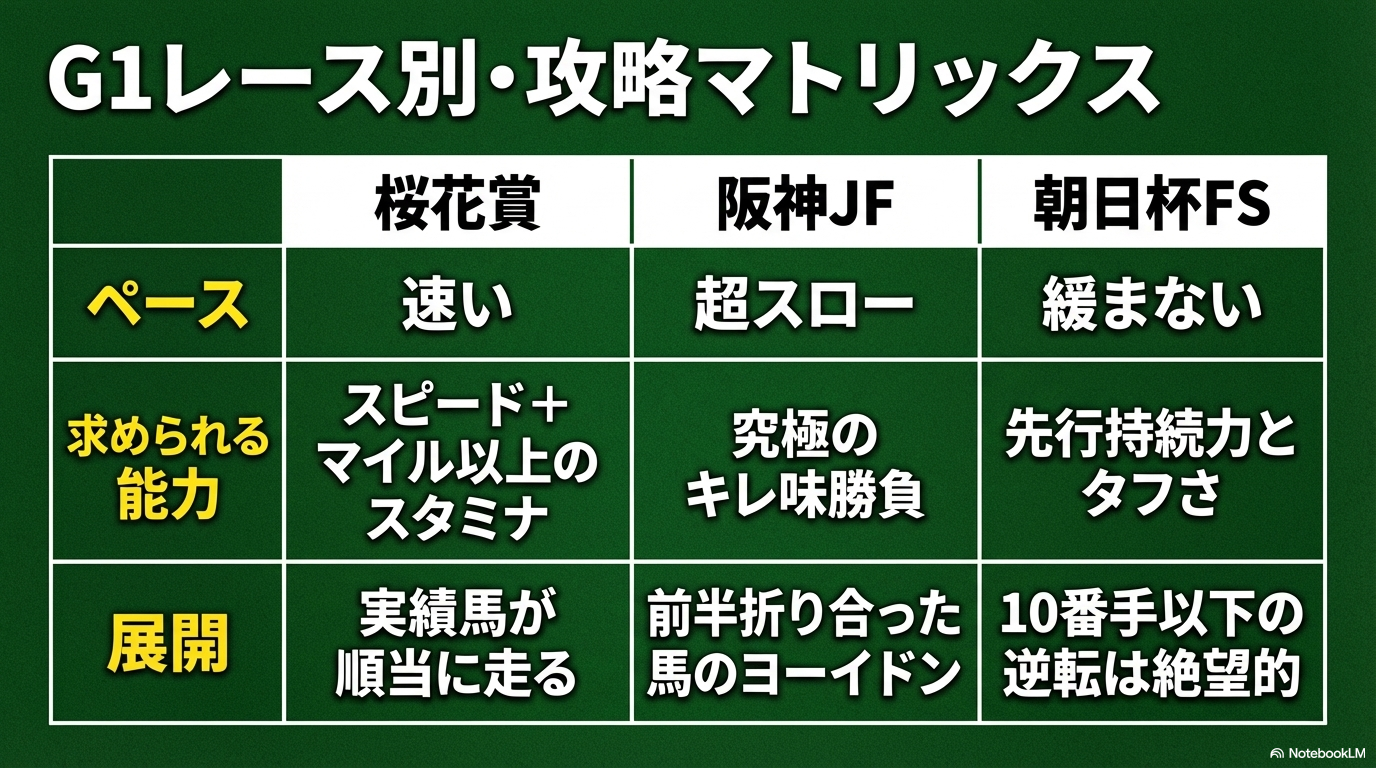• 脚質の選定:基本は「先行」。特に朝日杯FSなどの牡馬混合戦では、前に行ける機動力が勝利への絶対条件となります。