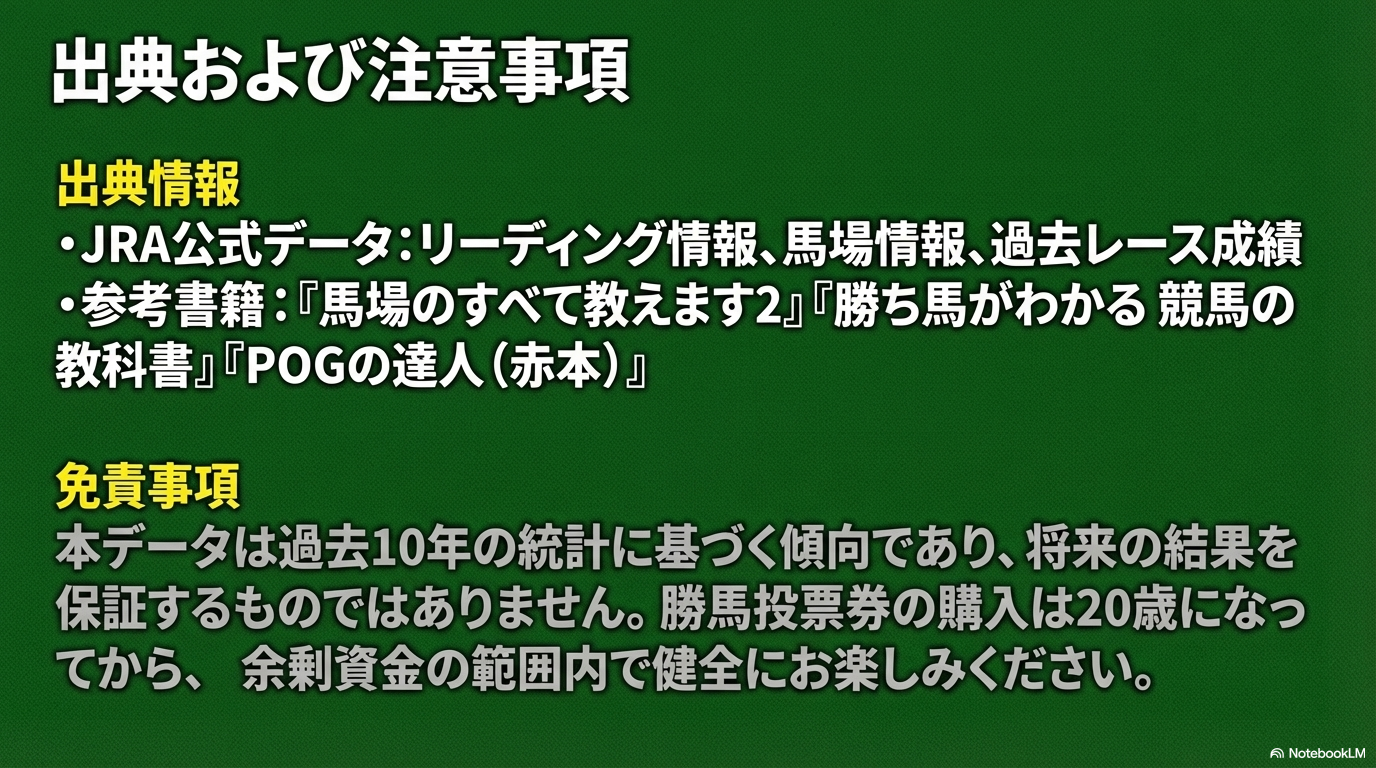 本記事で紹介した阪神芝1600mの過去10年データは、あくまで統計に基づく傾向であり、将来のレース結果を断定的に保証するものではありません。競馬には不確定要素が常に存在します。最終的な馬券の購入判断は、JRA公式サイトの最新情報を確認の上、ご自身の責任において行ってください。また、勝馬投票券の購入は20歳になってから、余剰資金の範囲内で健全に楽しみましょう。この記事が皆さんの競馬ライフをより豊かにする一助となれば幸いです。