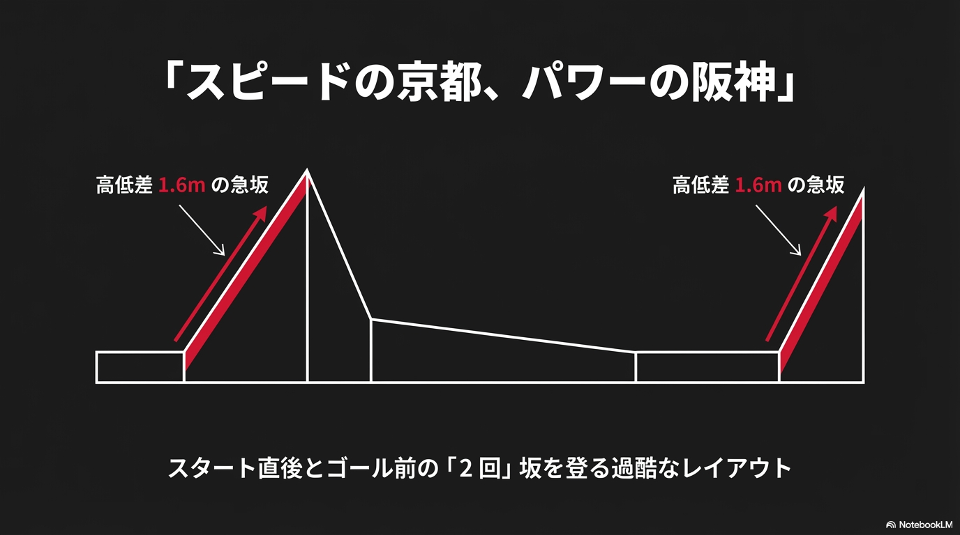 阪神ダート1800mを攻略する上で、絶対に無視できないのが「勝ちタイムの基準値」と「馬場状態による変化」の相関関係です。このコースはファンの間で「スピードの京都、パワーの阪神」と比較されるように、同じ1800mでも京都競馬場とは全く別物の適性が求められます。その最大の理由は、ホームストレッチに用意された高低差約1.6mの急坂。これをスタート直後とゴール前の計2回登らなければならない過酷なレイアウトが、全体時計を物理的に押し下げ、馬に極限のスタミナ消費を強いるのです。