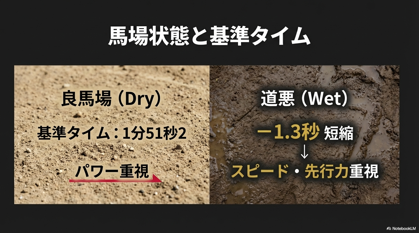 ここで特に注目したいのが、馬場状態による「戦術的な変容」です。良馬場では砂が深く、一歩ごとに蹄が沈み込むため、純粋なパワーとスタミナ自慢の馬が台頭します。しかし、ひとたび雨が降り馬場が水分を含むと、砂の粒子同士が表面張力で結びついて締まり、路盤をしっかりと捉えられるようになります。これにより推進力が逃げない高速馬場へと変貌を遂げるわけです。