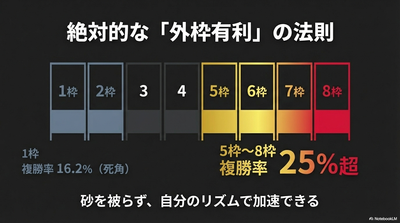 | 8枠 | 25.4% | 距離ロスはあるが、砂被りゼロで捲る競馬がしやすく安定。 |