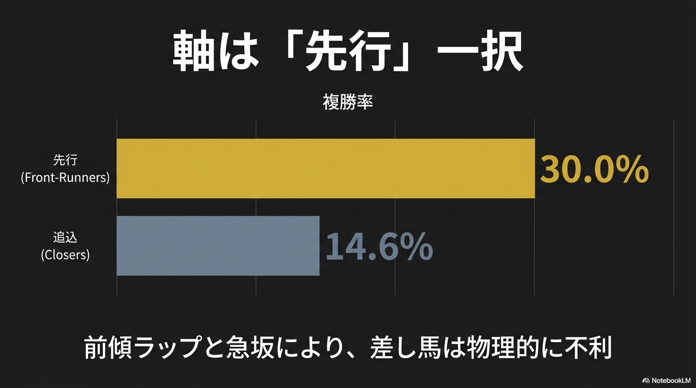 | 先行 | 30.0% | 最も信頼度が高い。坂を前に余力を残せる好位追走がベスト。 |