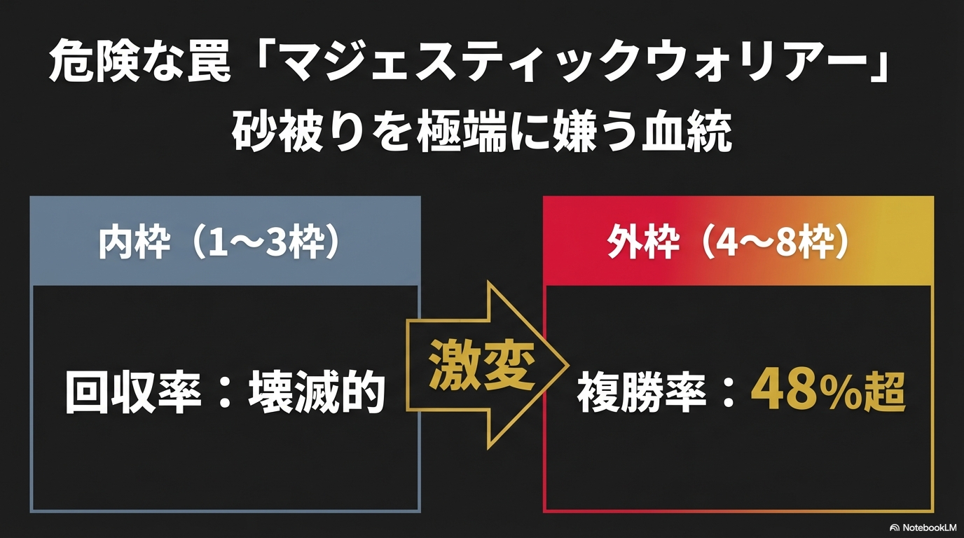 本コースにおいて血統と枠順の組み合わせで最も注意が必要なのがマジェスティックウォリアーです。産駒全体で見れば上位の成績ですが、その中身を分解すると極端なバイアスが見えてきます。砂被りを極端に嫌う性質があるため、1〜3枠に入った際の単勝回収率はわずか8%程度と絶望的です。しかし、4〜8枠の中・外枠に入れば複勝率は48.2%まで跳ね上がるため、馬柱の着順以上に「枠順一つで一変する」血統であることを覚えておきましょう。