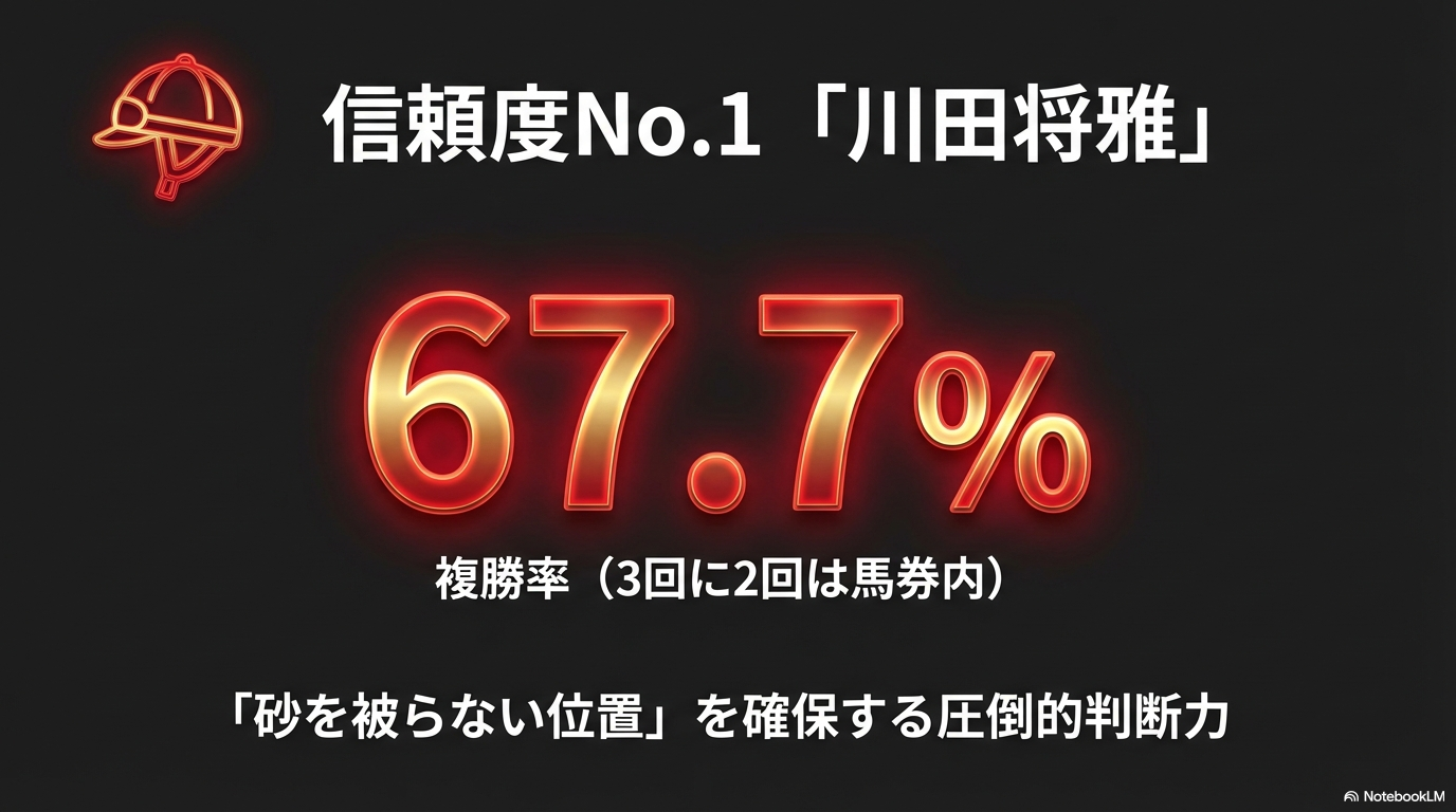 「確実性」という面で他の追随を許さないのが、川田将雅騎手です。彼の複勝率は67.7%に達しており、これは3回走れば2回以上は馬券に絡むという計算になります。川田騎手の凄さは、スタートから1コーナーまでの短い距離(約303m)で、馬にとって最もストレスのない「砂を被らない位置」を確実に確保する判断力にあります。