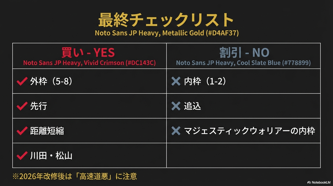 - 軸選びの鉄則: 5〜8枠の外枠、先行力のある血統(シニスターミニスター等)、そして川田・松山・岩田望騎手のいずれかが騎乗。この3要素が重なった馬は、単なる人気馬ではなく、コース特性を最大限に活かせる「不動の軸」となります。