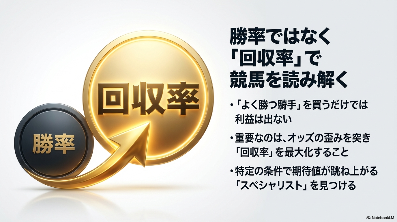 - 勝率の高さだけでなく、期待値(単勝・複勝回収率)に優れた騎手を特定する