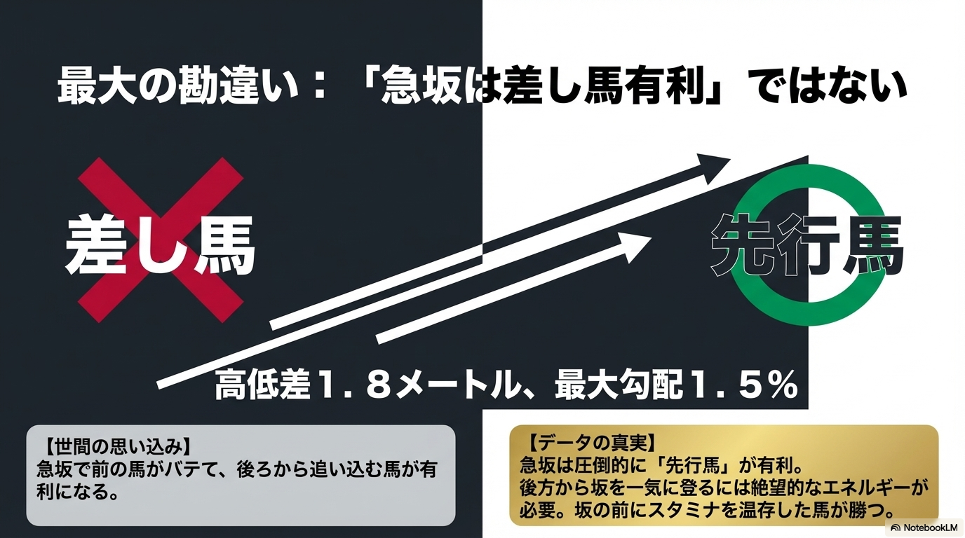 - 先行馬の優位性: 坂での逆転を狙うよりも、前で粘る馬の方が統計的な期待値は高い