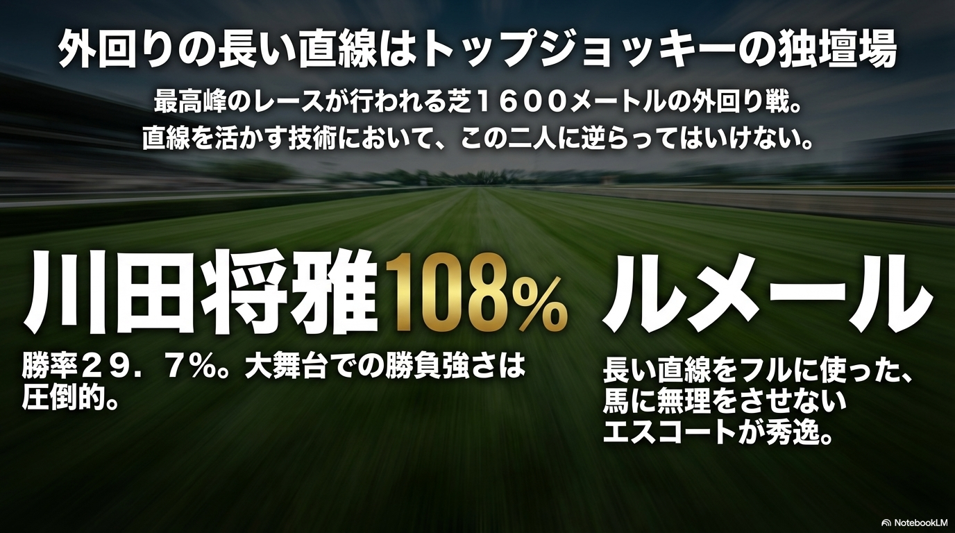 また、東の横綱であるC.ルメール騎手も、この外回りマイル戦では勝率23.1%、複勝率は5割を超えてきます。ルメール騎手の凄さは、長い直線をフルに使った「馬に無理をさせないエスコート」にあり、外回りコースのスケールを最大限に活かす騎乗は、まさに世界レベルと言えるでしょう。