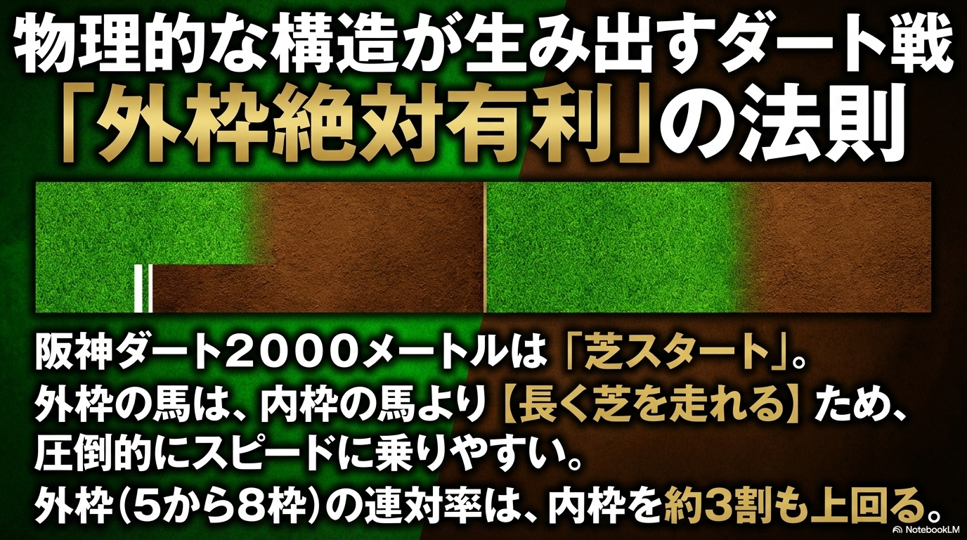 阪神ダート2000mは、JRA全競馬場の中でも極めて珍しい「芝内回りの4コーナーポケット」からスタートを切ります。最初の約100メートルが芝コースとなっており、ここでいかにスピードに乗れるかが勝負の分かれ目となります。外枠の馬は内枠の馬に比べて芝を走る距離が物理的に長くなるため、ダッシュがつきやすく、スムーズに好位を確保できるというカラクリがあるんです。実際にデータを見ると、5〜8枠の連対率は1〜4枠を約3割も上回っており、このバイアスを馬券に反映させない手はありません。