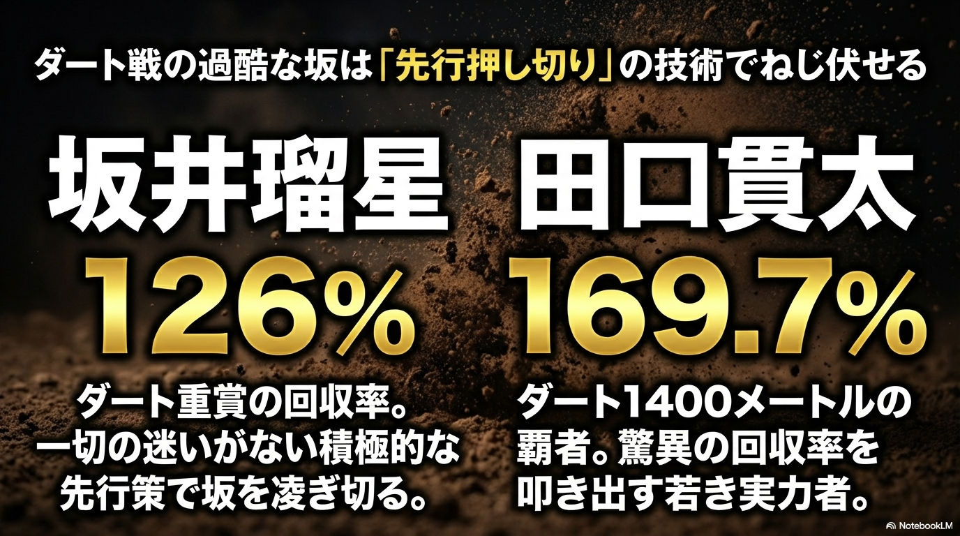 この「物理的チート」とも言える外枠の利を完璧に使いこなしているのが、坂井瑠星騎手です。彼はもともと先行力を引き出す技術に長けていますが、阪神ダートではその積極性がさらに活きています。外枠から被せられずにポジションを取り、他馬の砂被り(キックバック)を避けながら最後の急坂へ突入するエスコートは芸術的ですらあります。坂井騎手はダート重賞でも単勝回収率126%を記録しており、阪神のダート中距離で彼が外枠に入ったら、まずは逆らわないのが賢明かなと思います。