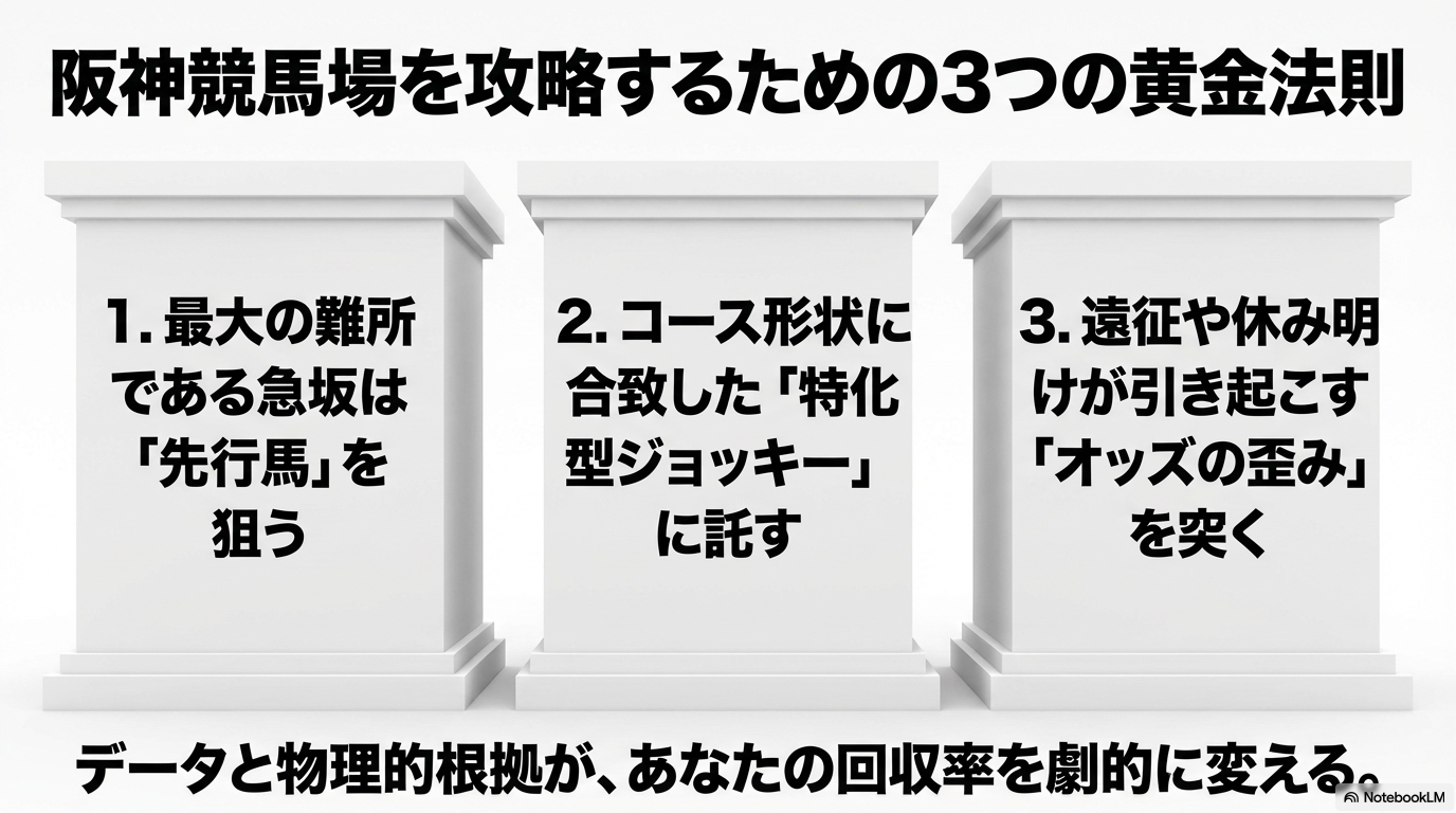 これらのデータは、主催者であるJRAが発表する膨大なレース結果に基づいた統計的な傾向です。例えば、阪神競馬場のコース構造や起伏の詳細は、JRA公式サイトの解説でもその過酷さが裏付けられています。(出典:JRA日本中央競馬会『阪神競馬場コース紹介』)