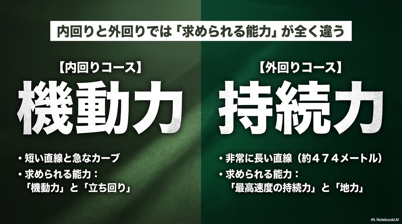 - 「内回り・外回り」の違いにより、求められる技術(加速力か持続力か)が激変する