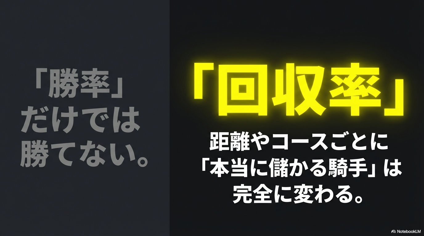 競馬で利益を出し続けるためには、勝率以上に「回収率」が重要であり、特定の条件——例えば、1200mの電撃戦なのか、あるいは主要G1が開催される1600mのタフなマイル戦なのか——によって、狙うべき騎手はガラリと変わってきます。