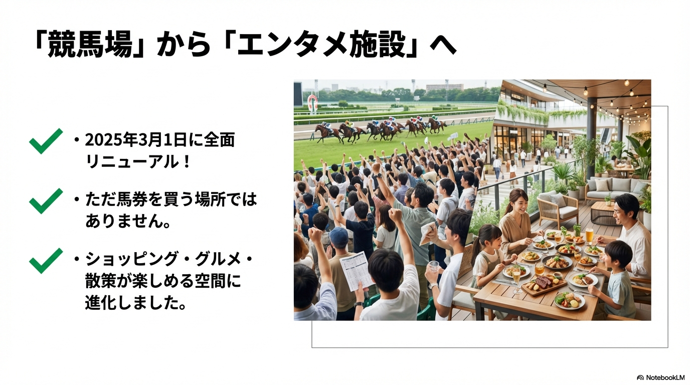 特に「グランプリストリート」は、これまでの競馬場のイメージを一新するような開放的な空間です。お気に入りの馬のグッズを手に、新しくなったフードコートでグルメを楽しみながら次のレースの予想を練る……そんな時間が、競馬場での最高の贅沢かなと思います。私自身、リニューアル後の綺麗なショップを歩いているだけで、まるでテーマパークに来たようなワクワク感に包まれました。