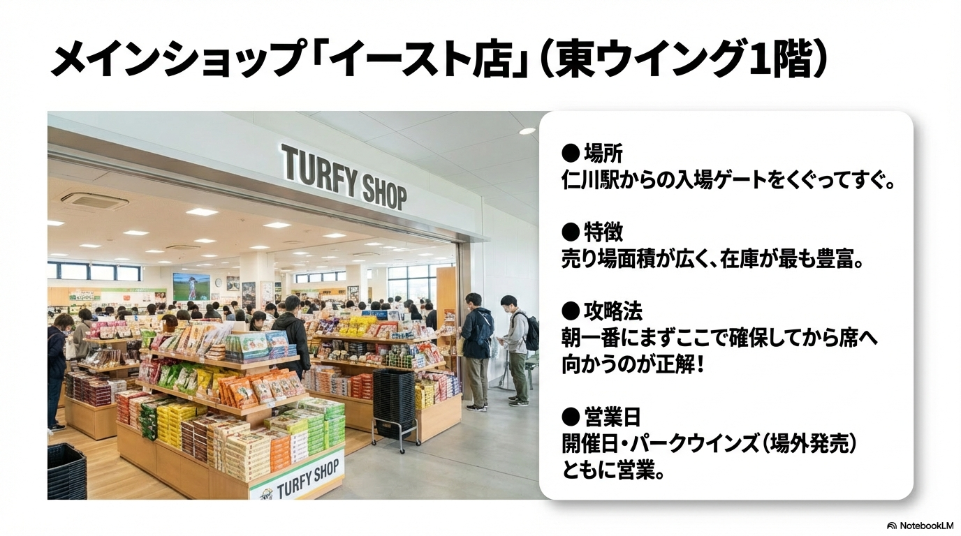 ここで一つ、私自身の経験からお伝えしたい注意点があります。それは、場内にある全てのショップが開いているわけではない、ということです。パークウインズ時は、メインとなる「イースト店(東ウィング1階)」は原則営業していますが、レース観戦エリアに近い「ウエスト店(西ウィング2階)」などは休止している場合がよくあります。ですので、「せっかく西の方まで歩いたのに閉まっていた!」なんてことにならないよう、まずはイースト店を目指すのが無難です。