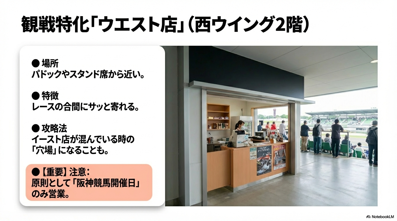 • ウエスト店は「開催日のみ」の秘密基地:スタンド西側のウエスト店は、実はレース観戦エリアから最も近い穴場ですが、パークウインズ(場外発売)日はお休みになることが多いので注意が必要です。