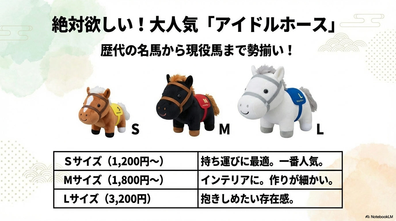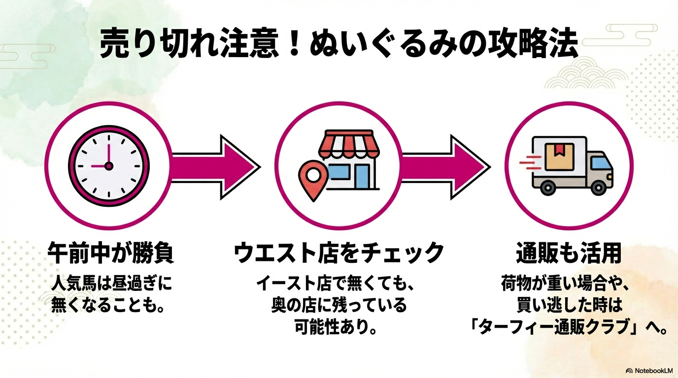 • 人気馬のぬいぐるみは午前中が勝負:アイドルホースなどの定番かつ人気の商品は、G1開催日ともなると午後には売り切れてしまうことが多々あります。特に入場直後のイースト店でのチェックを習慣にしましょう。