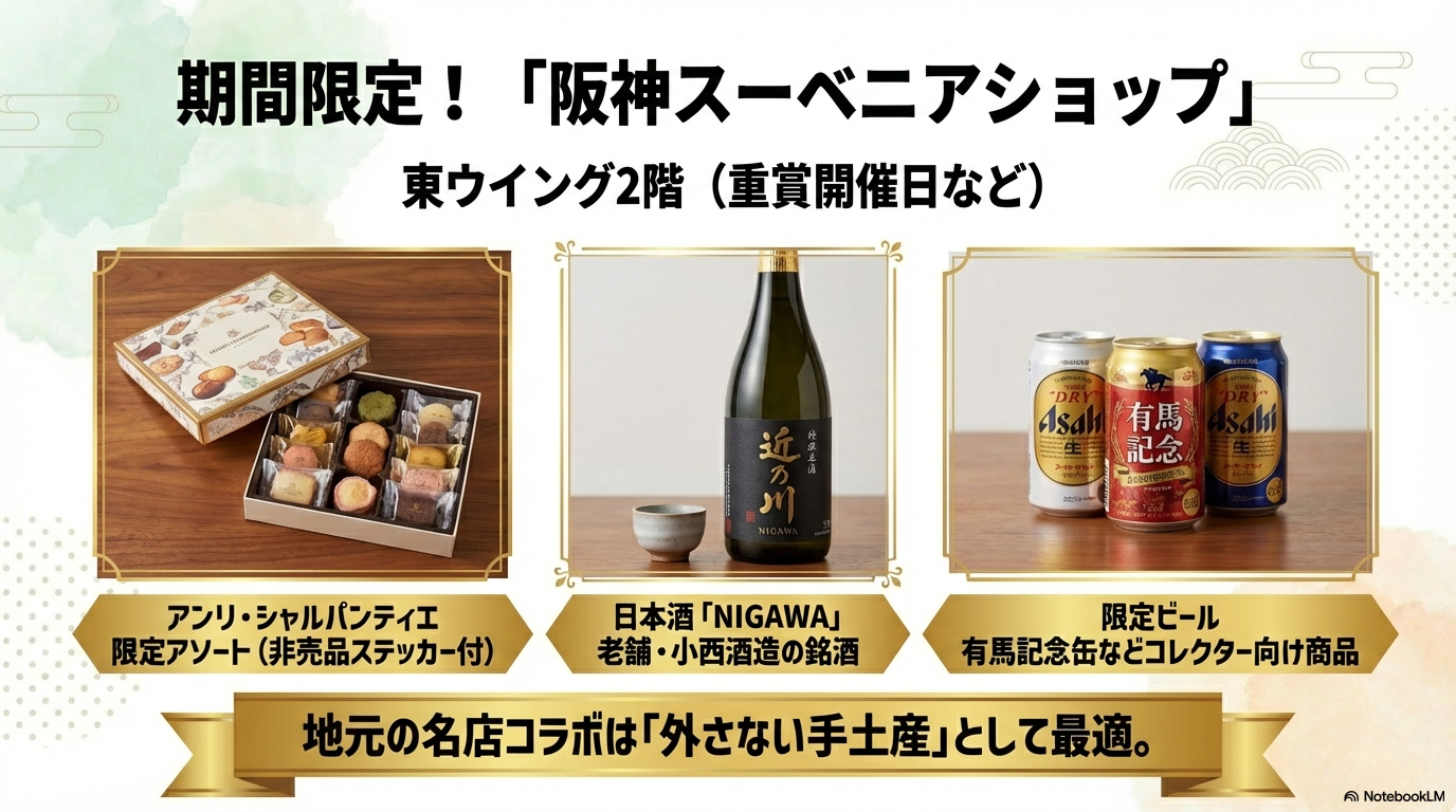 特別な日のお土産を探しているなら、スタンド東2階コンコースに期間限定で姿を現す「阪神スーベニアショップ」をぜひチェックしてほしいです。ここでは、通常のターフィーショップで販売されている馬のぬいぐるみやストラップといった定番グッズとは一線を画す、いわゆる「デパ地下級」のクオリティを誇る「地元ブランドとのコラボ商品」がずらりと並びます。