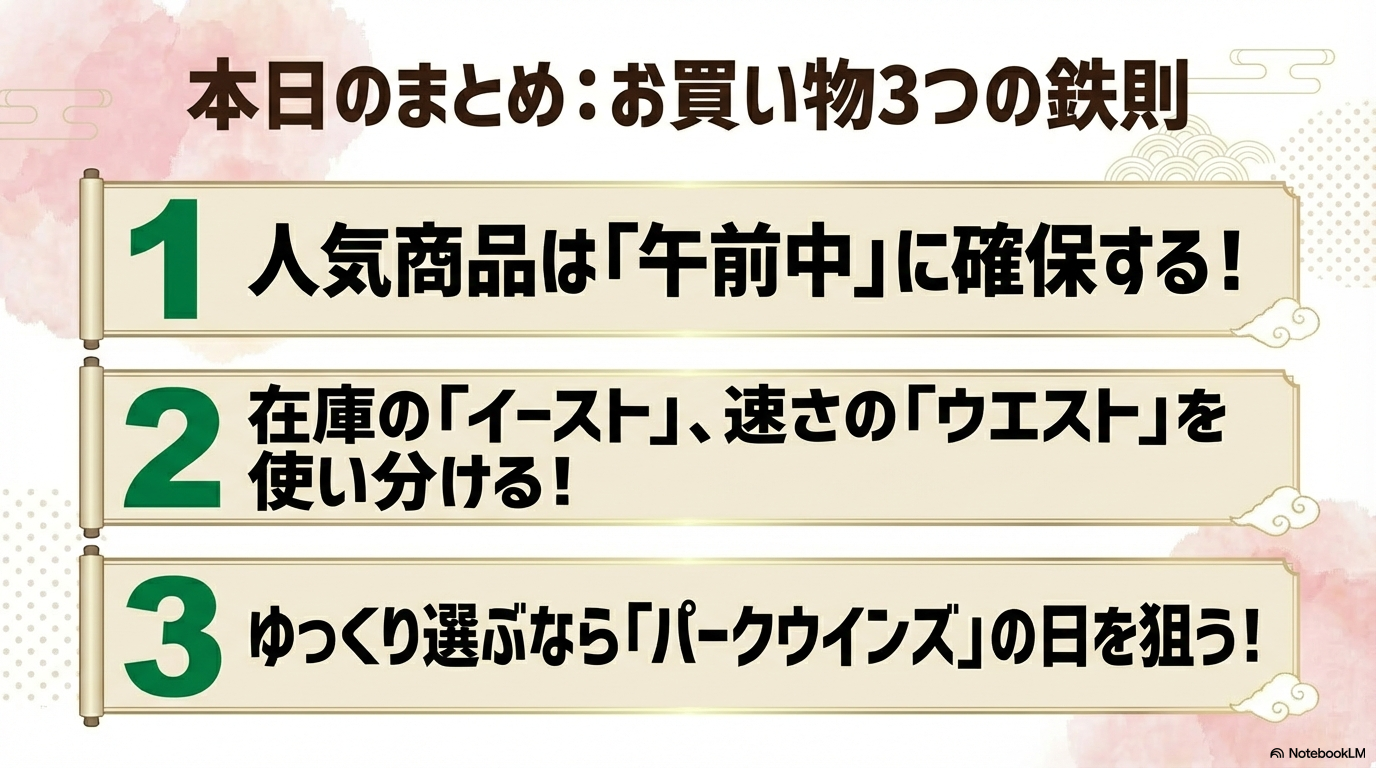 ここまで、2025年3月にグランドリニューアルを遂げた阪神競馬場のグッズショップについて、場所や営業時間、さらには注目の限定アイテムまで幅広くご紹介してきました。最後に、広い場内で迷わずに、そして後悔しないためのお買い物ポイントをギュッとまとめておさらいしましょう。