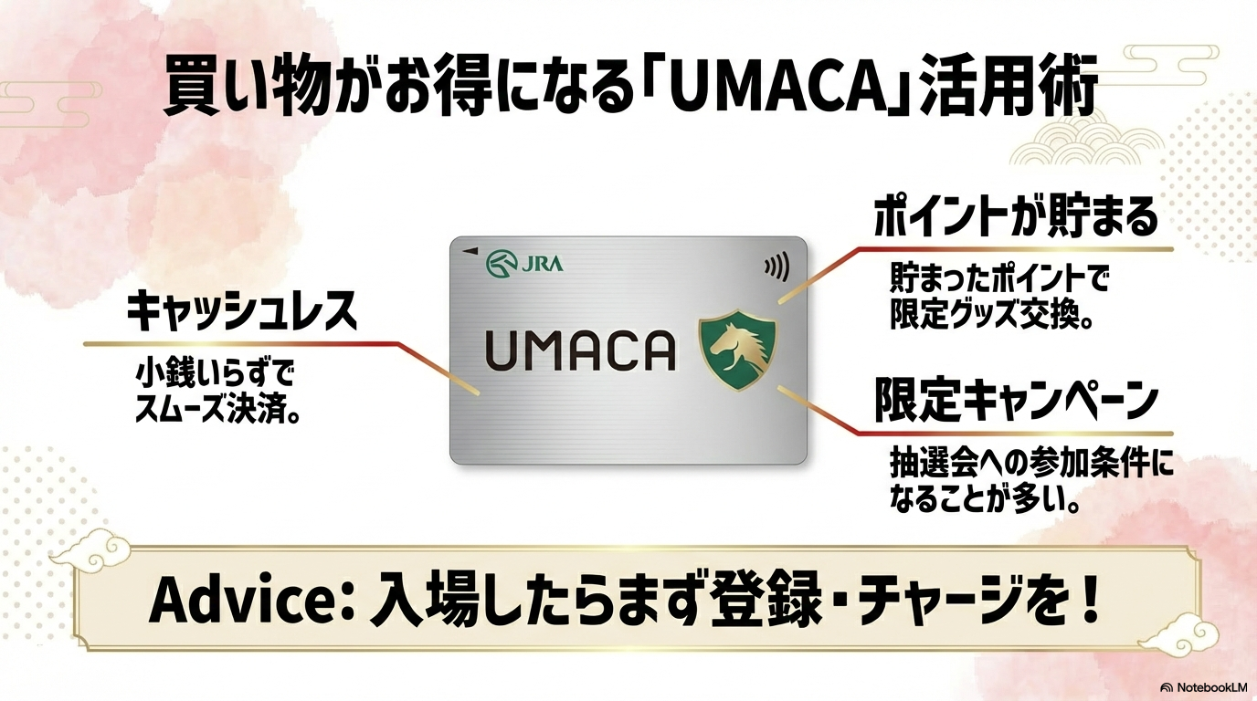 また、GI開催日は場内のUMACAを利用したキャンペーンと連動していることも多いです。限定グッズを購入しつつ、UMACAをスマートに活用することで、さらなる特典が得られるかもしれません。UMACAの賢いポイントの貯め方については、こちらの記事で詳しく解説していますので、あわせて確認してみてくださいね。