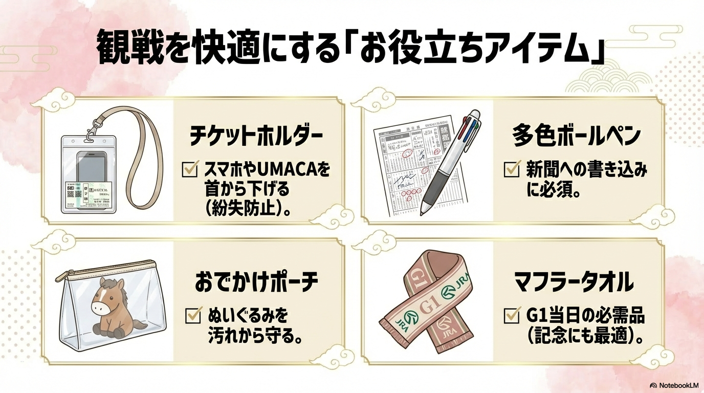 特に2025年のリニューアル以降、入場ゲートでのQRコード認証やUMACAを利用したキャッシュレス投票が主流になったことで、身の回りの小物の管理が以前よりも重要になっています。ここでは、私が実際に使ってみて「これは便利!」と感じたアイテムや、ショップで見つけたらぜひ手にとってほしいお役立ちグッズを詳しく解説しますね。