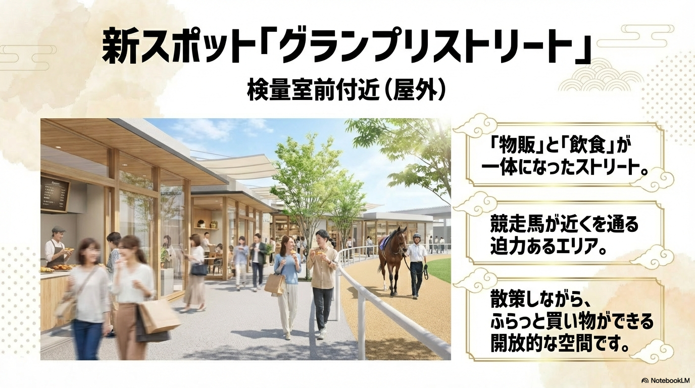 特に私が感動したのは、空間全体に漂う「お祭り感」と「開放感」です。ただ物を売るだけでなく、歩いているだけでワクワクするような仕掛けが随所に散りばめられていて、私のような競馬ファンはもちろん、初めて訪れる方でも自然と場内の雰囲気に馴染めるよう工夫されているなと感じました。それでは、具体的にどのようなエリアが誕生したのか、詳しく見ていきましょう。