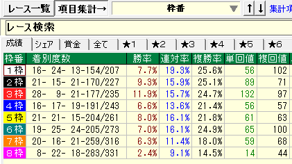 - 3~4コーナーで下り坂となっておりペースアップしやすいため、コーナーをロスなく回った馬が有利。