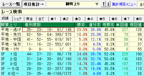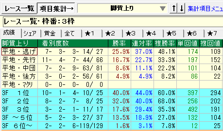 - 枠・脚質⇒3枠の逃げ、先行馬