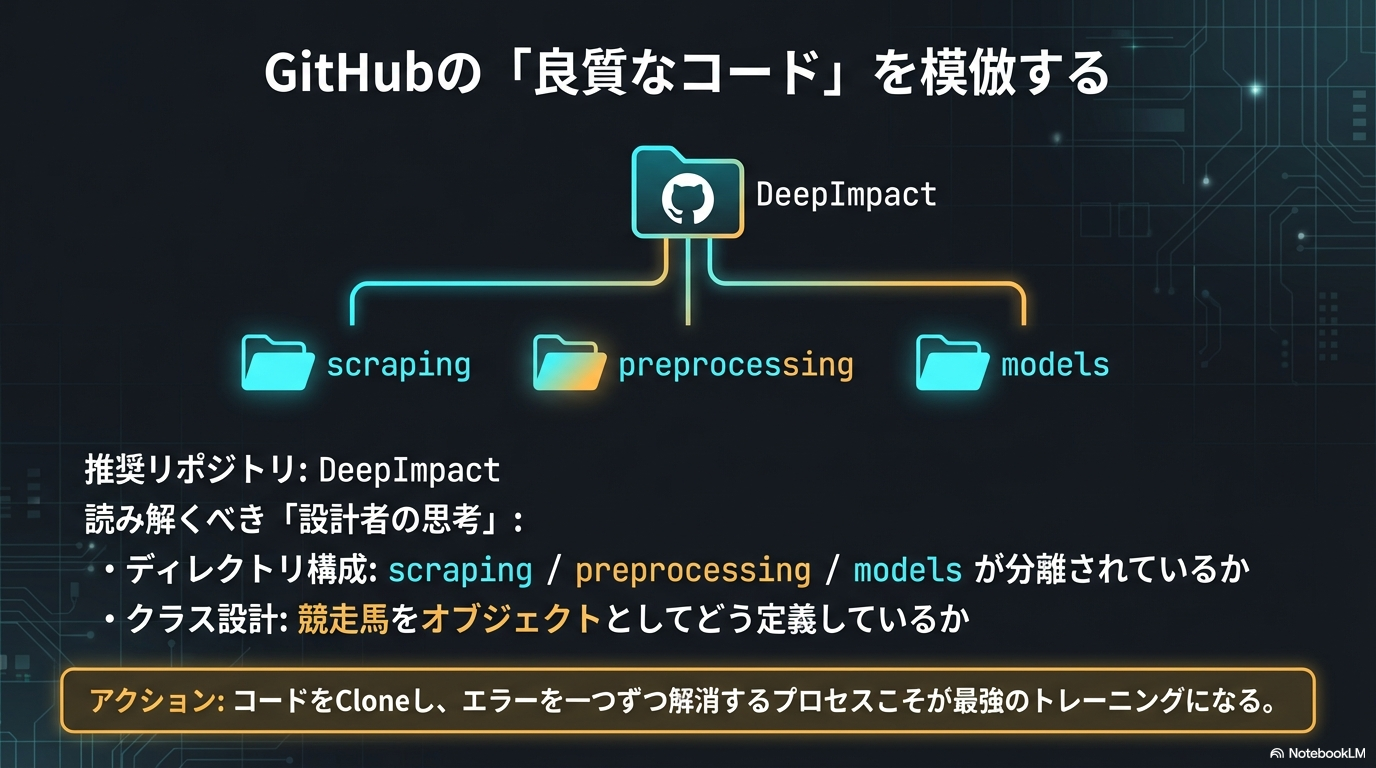 エンジニアの端くれとして「全部自分で書きたい」という気持ちは痛いほど分かります。しかし、競馬AI開発においては、そのプライドが挫折の元です。データの前処理や評価関数の設計など、車輪の再発明をすべきではありません。まずはGitHubで公開されている「DeepImpact」などの優れたOSS(オープンソースソフトウェア)を読み解き、それを自分の手元で動かすことから始めてください。「なぜこの特徴量を作ったのか?」「なぜこの損失関数を選んだのか?」という先駆者の思考プロセスをトレースすることが、最強の学習法です。