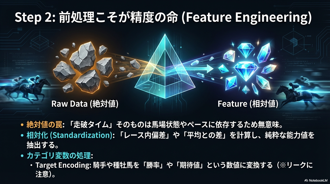 データが揃ったら、次はそれをどう料理するかです。単に「前走のタイム」や「着順」をそのまま学習させても、精度の高いモデルは生まれません。競馬は相対評価のゲームだからです。