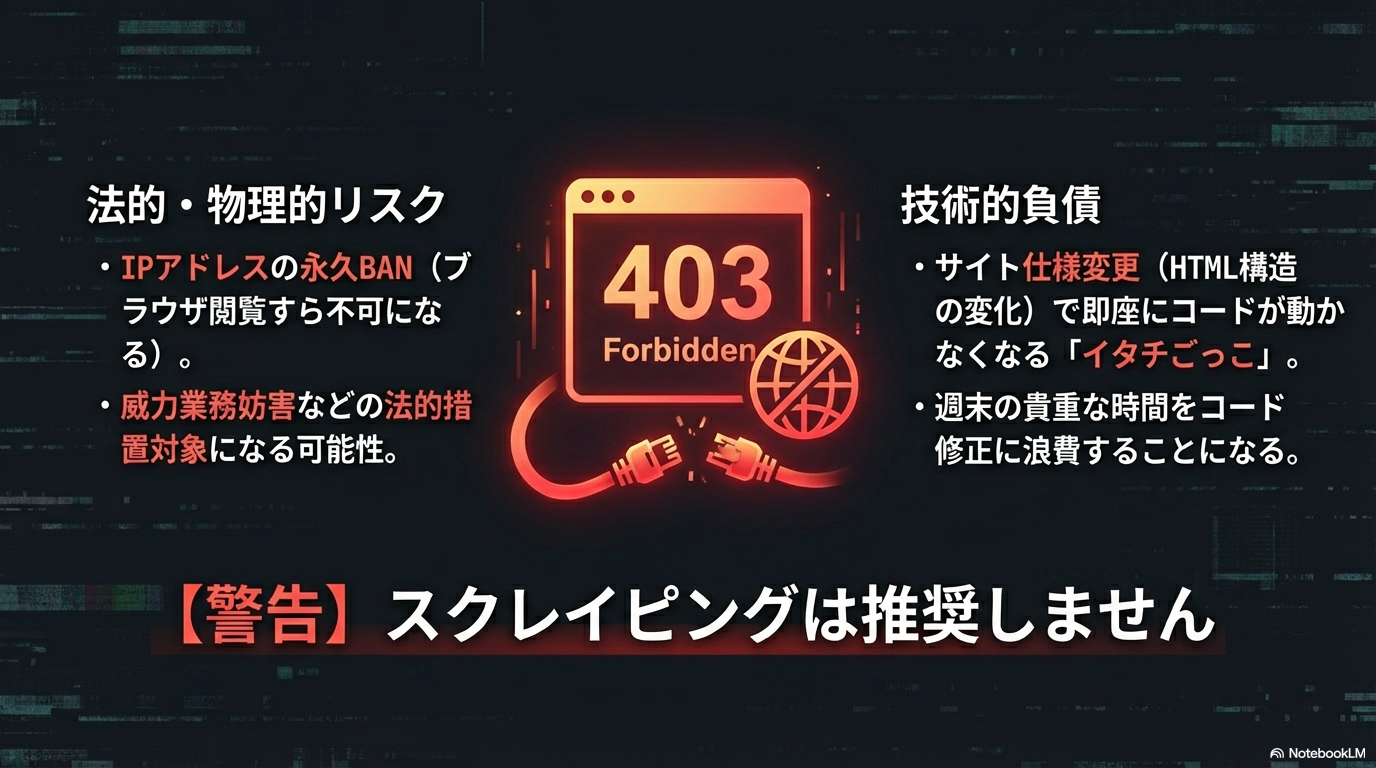 これらの記事は、Pythonの学習用としては面白いかもしれません。しかし、これから「勝てるAI」を本気で運用しようと考えているあなたには、安易なスクレイピングは絶対に推奨できません。それは単に「マナーが悪い」という次元の話ではなく、あなたの開発環境そのものを危険に晒し、最悪の場合は法的責任を問われるリスクすらあるからです。