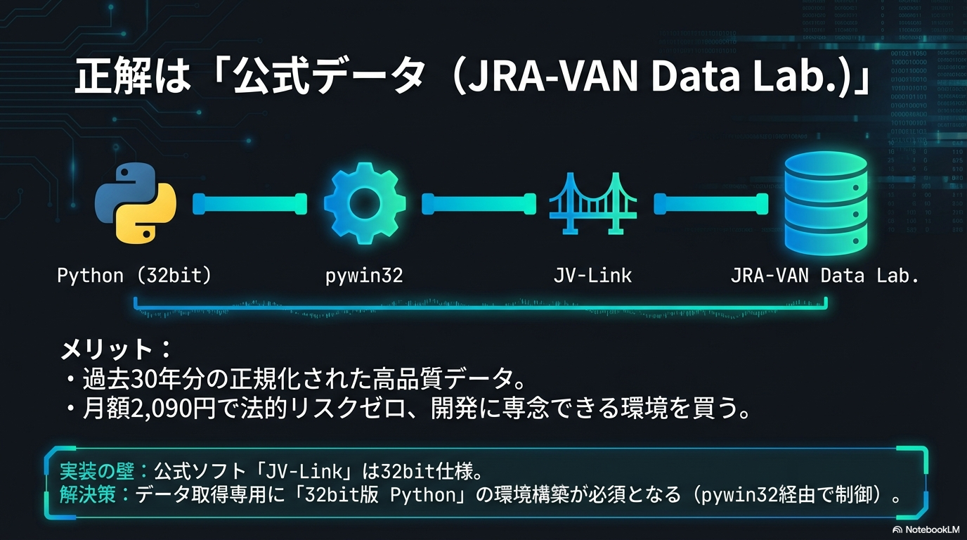 ここは、公式データを活用する正攻法を選びましょう。Windows専用にはなりますが、JRA公式のデータ配信サービスを活用し、pywin32ライブラリを介してデータを自動取得するパイプラインを構築することが、安定運用の第一歩です。これにより、30年分以上の正確無比な公式記録を、法的リスクなしに使い倒すことができます。