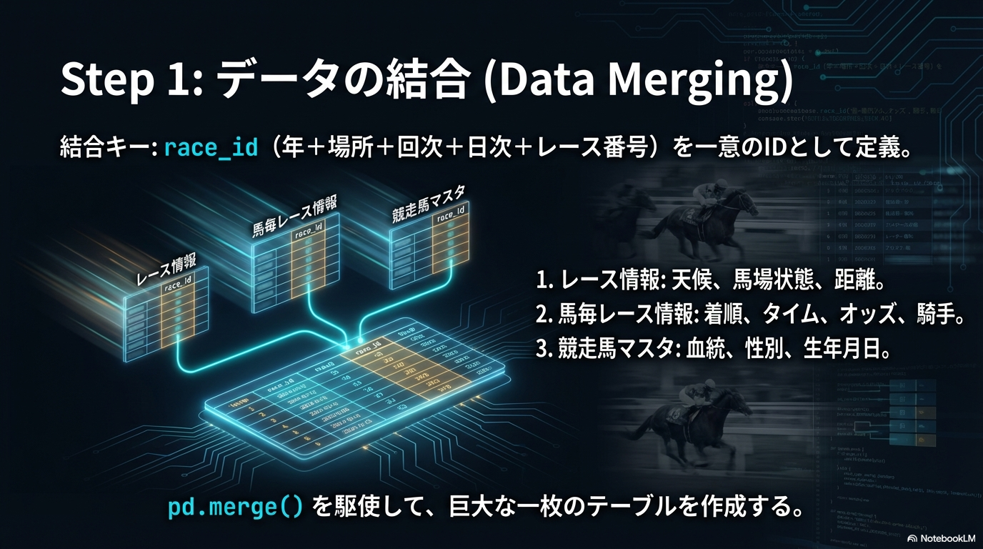 基本的には、以下の3つの主要データをrace_id(レースID)という共通のキーを使って結合(Merge)します。