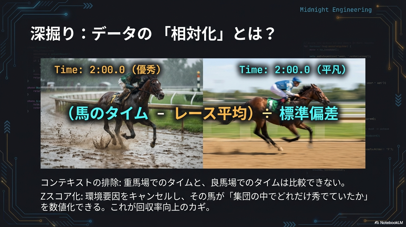 - 相対化(Standardization):その日の馬場状態やペースに合わせて、タイムを偏差値化する。